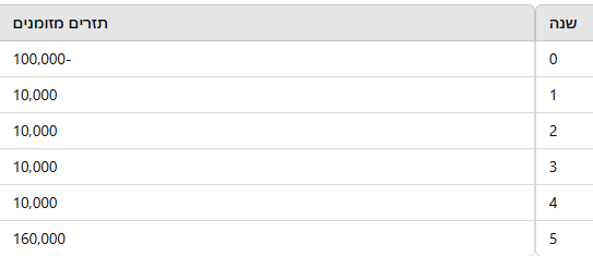 – השקעה ראשונית: 100,000- שח (יוצאת בשנה 0).